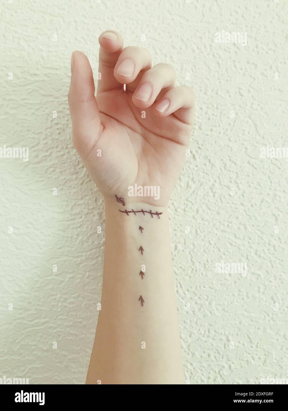 Close Up Of Hand With Tattoo Against Wall Stock Photo Alamy